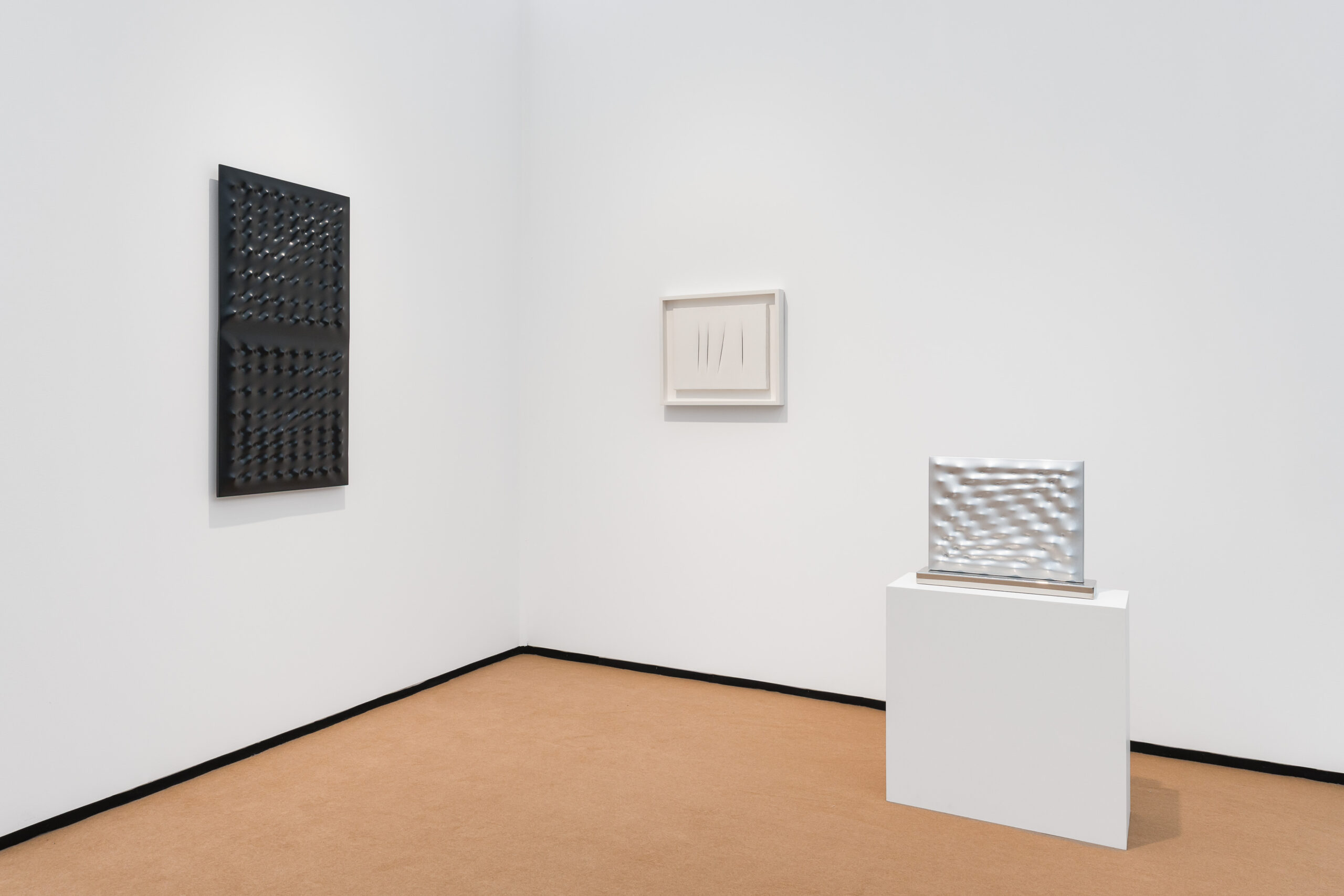 Enrico Castellani’s innovative manipulation of surface and structure is represented by Superficie bifronte argento (2012), one of the aluminium sculptures he focused on between 2006 and 2013. Castellani’s minimalist practice explores light, shadow, and geometric rhythm—pushing the boundaries of perception and material form.