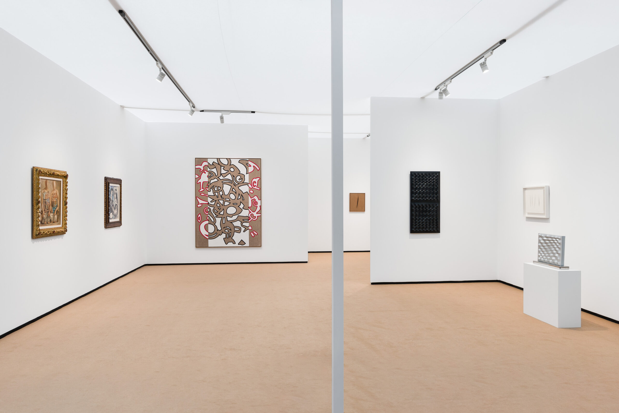 At the centre of the presentation is Lucio Fontana’s iconic Concetto Spaziale, Attesa (1962), a powerful example of his radical gesture of slashing the canvas. This single cut through raw fabric invites viewers into a new way of thinking about space, dimension, and materiality. With one decisive act, Fontana opens up the surface—encouraging reflection on how simplicity can carry profound conceptual weight.