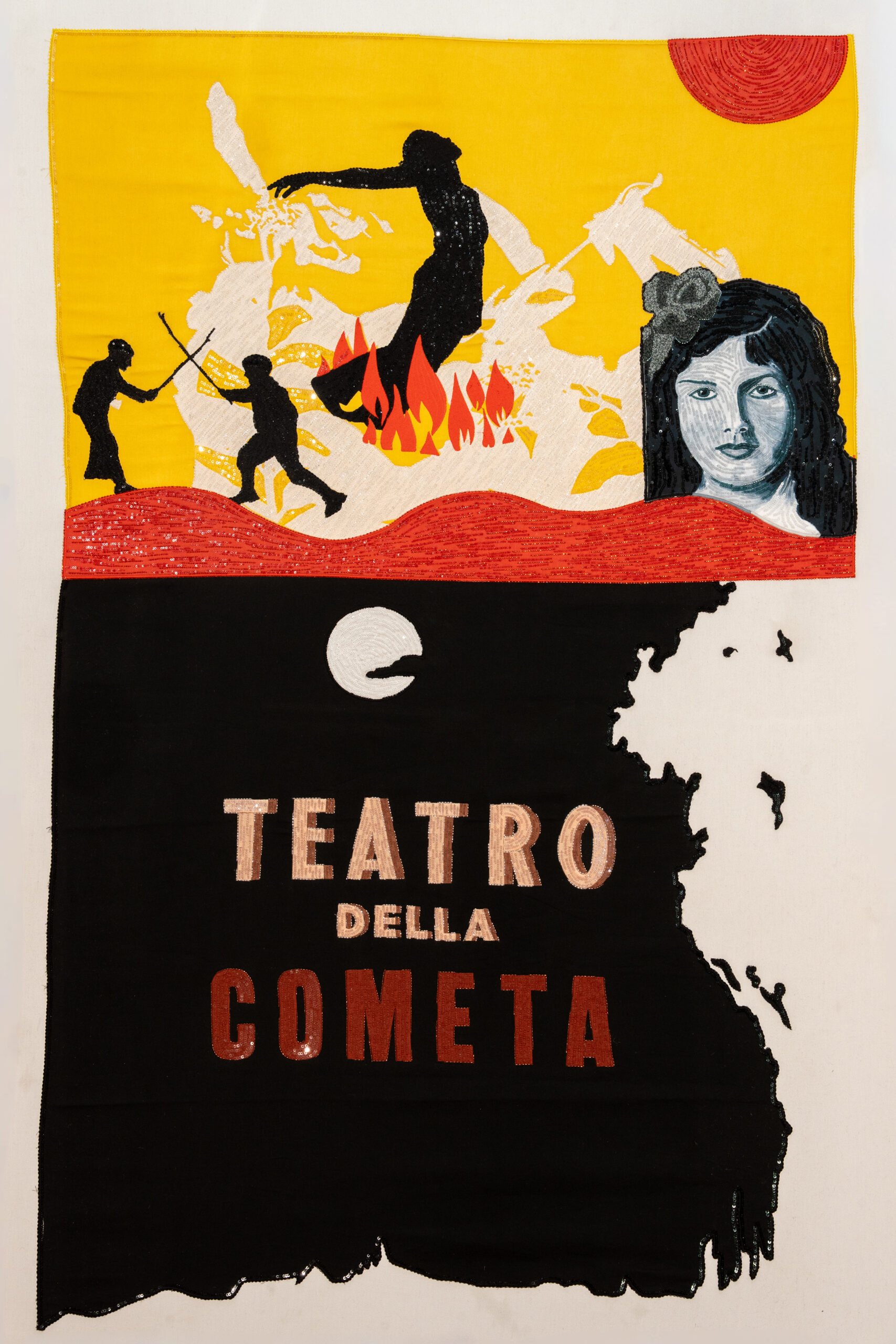 The Theatre of Commons è il titolo di questa installazione site-specific in cui la presenza del paesaggio è preponderante in quanto elemento fondante delle comunità umane. Con il termine Commons l’artista sottolinea ancora una volta l’importanza del concento di comunità, di condivisione dei beni e delle pratiche collettive, tutti elementi che hanno una forte risonanza, storica, politica e visiva, con la pratica del ricamo. Questa serie di banners ricamati a mano, realizzati in stretta collaborazione con gli atelier della scuola di ricamo Chanakya di Mumbai, sostituiscono i tendaggi preesistenti e decorano le pareti ribaltando la percezione dello spazio che in questo modo perde la sua funzione di contenitore neutrale per diventare una piazza vitale e un motore mentale.