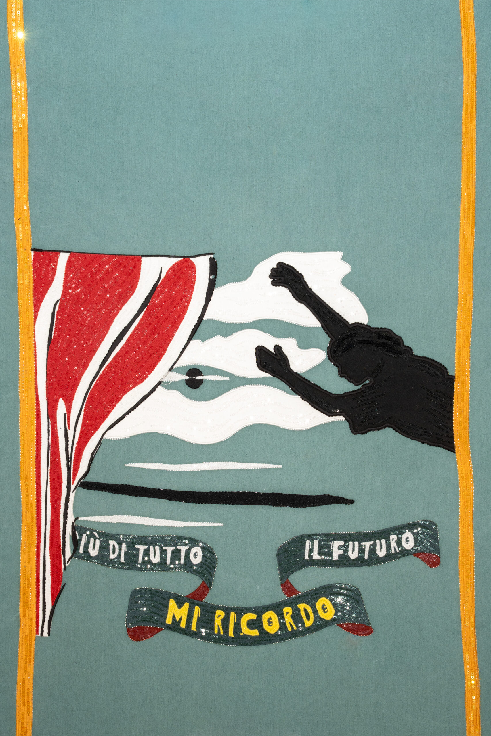 Attraverso questi attraenti stendardi Senatore esplora le numerose sfaccettature ed eredità dei sistemi di aggregazione comunitaria tipiche delle cerimonie popolari in cui il gonfalone veniva